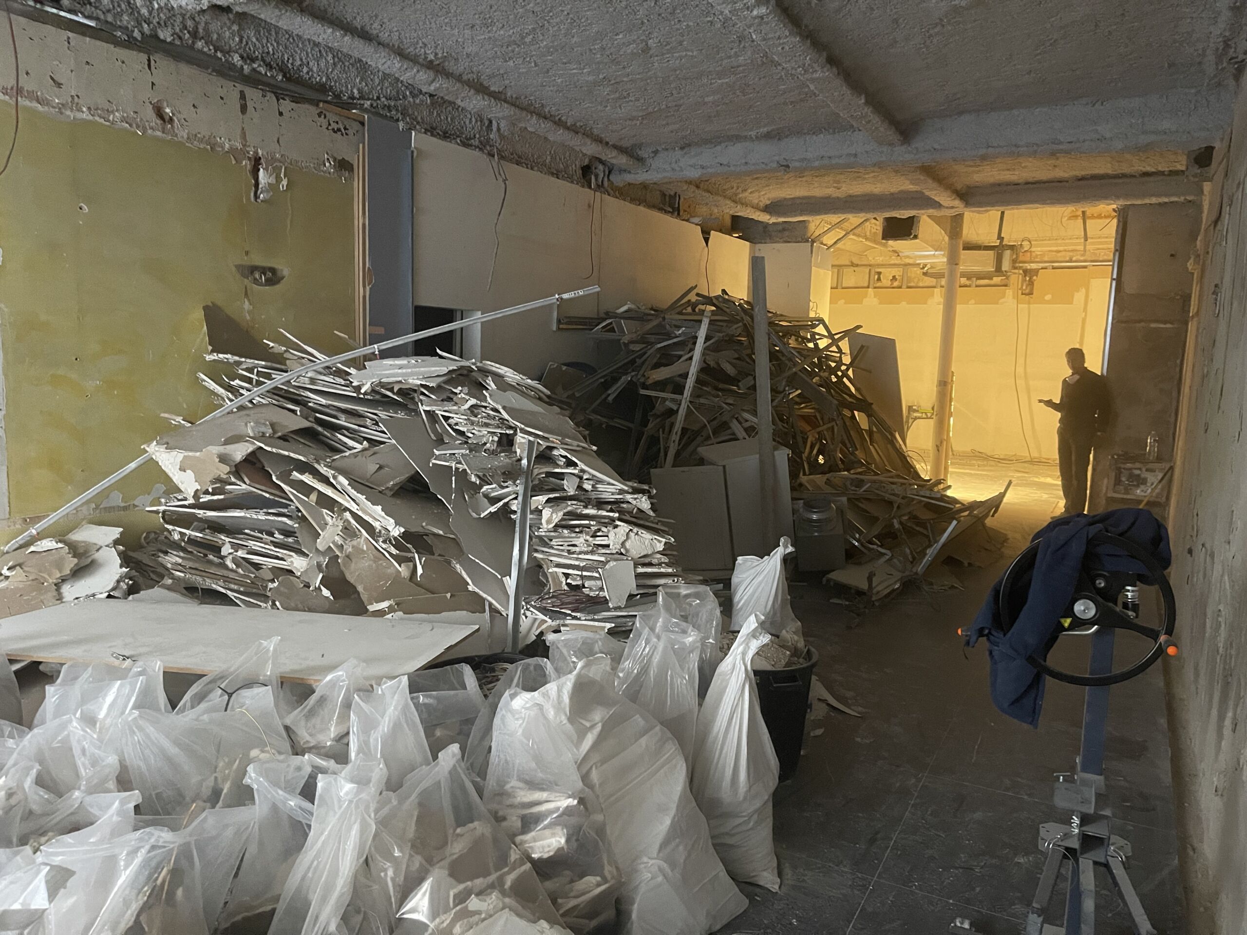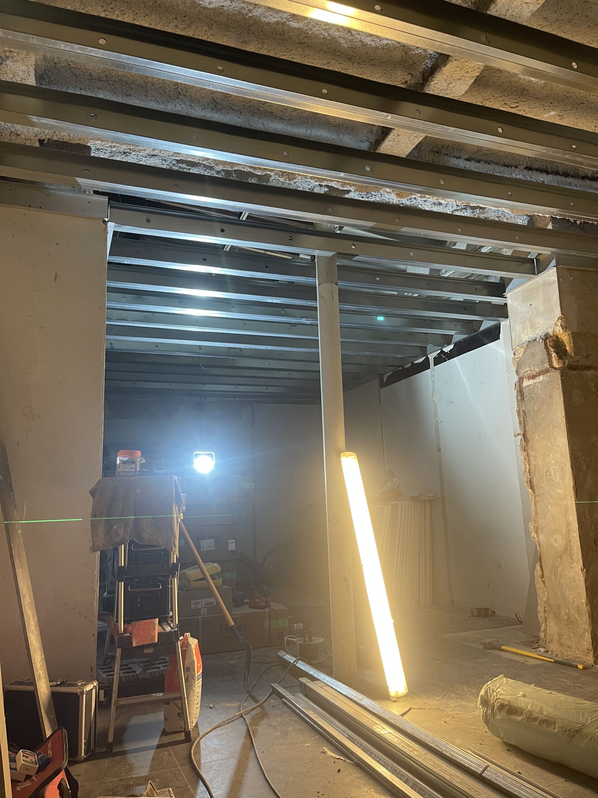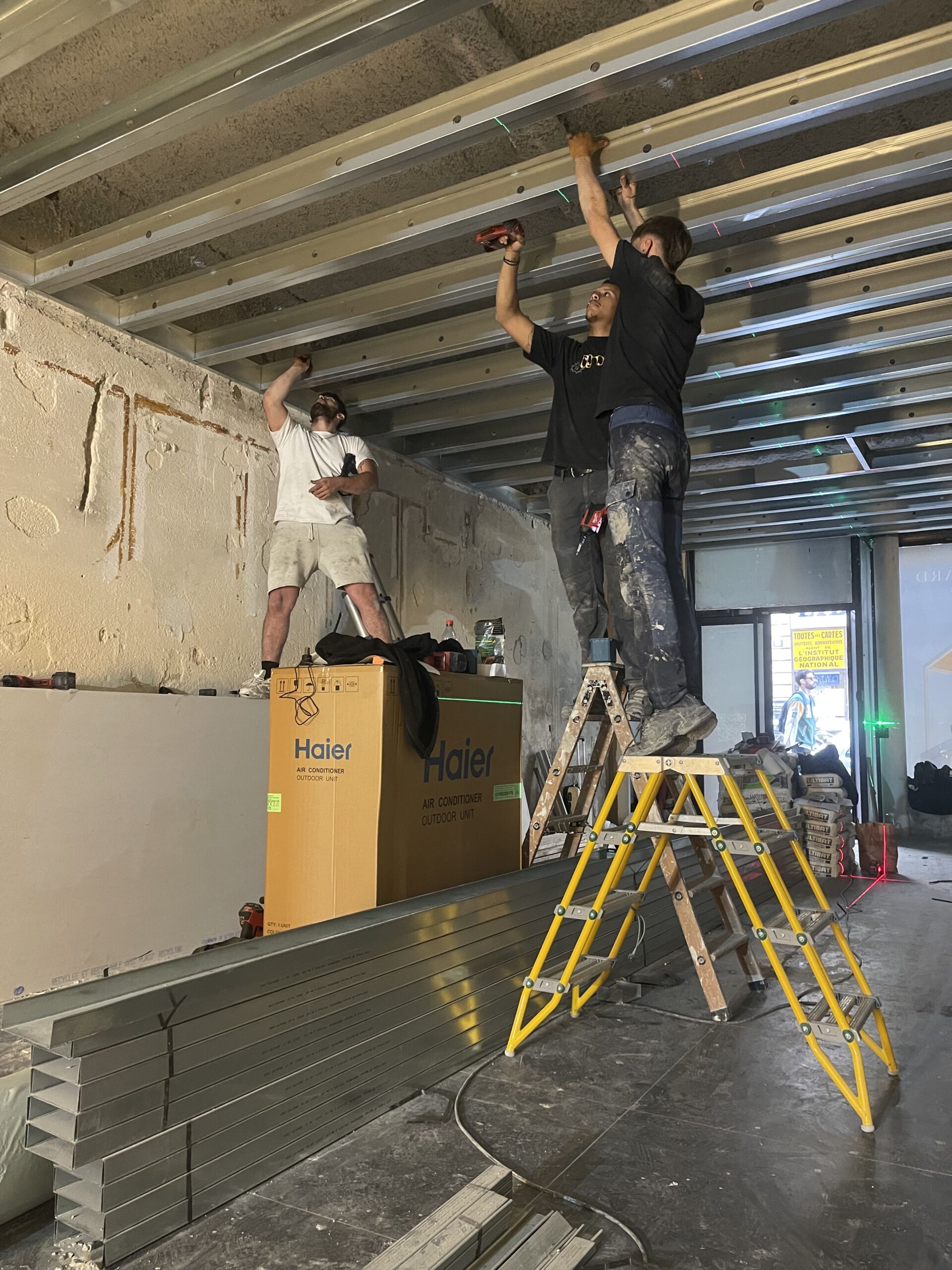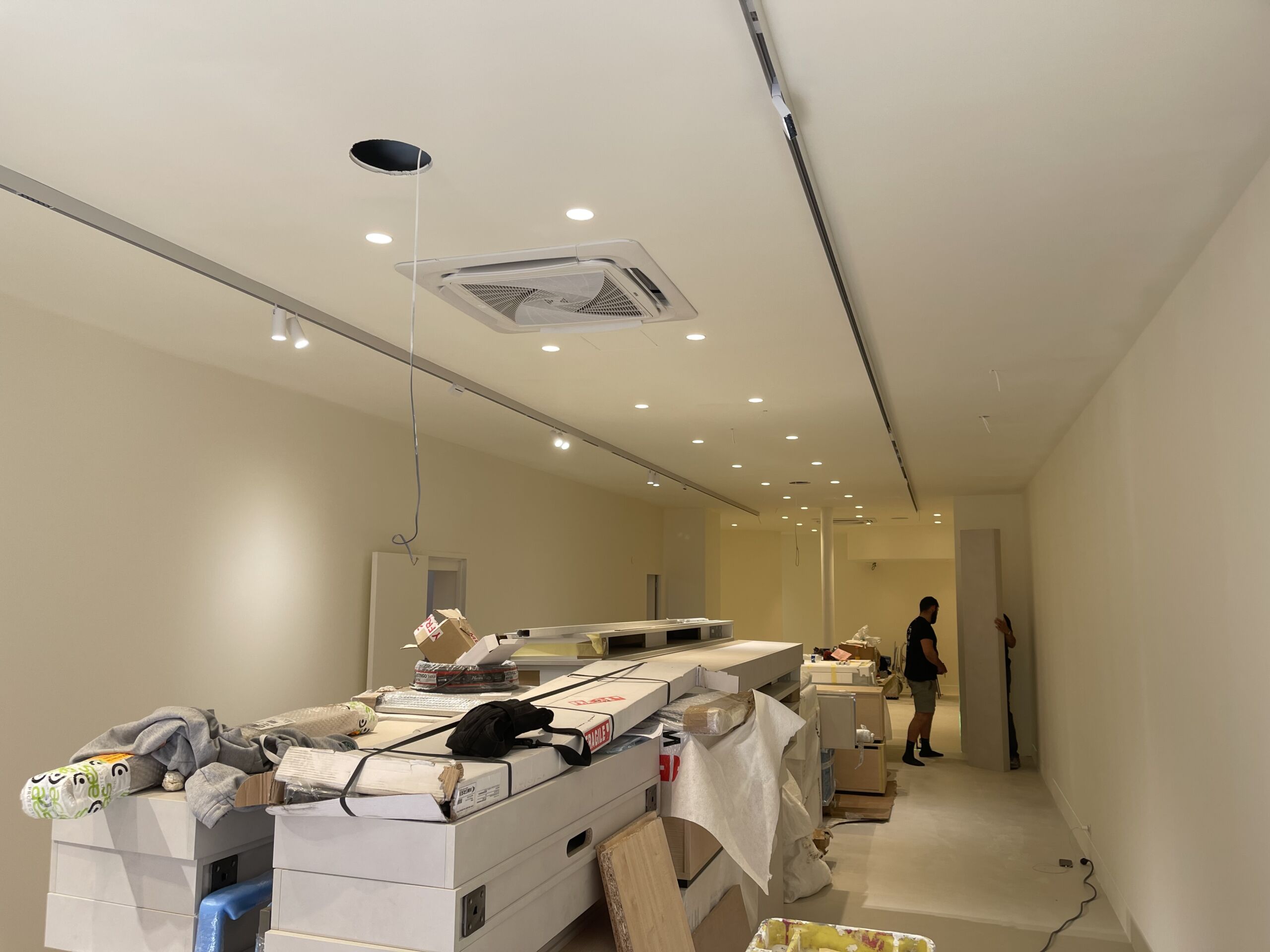 Côté stock, les travaux ont inclus un plafond technique en dalles 600×600, la reprise complète du placo, la pose d’un sol en lino et la peinture intégrale pour un rendu propre et fonctionnel.